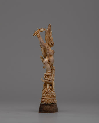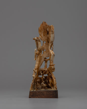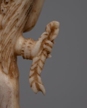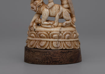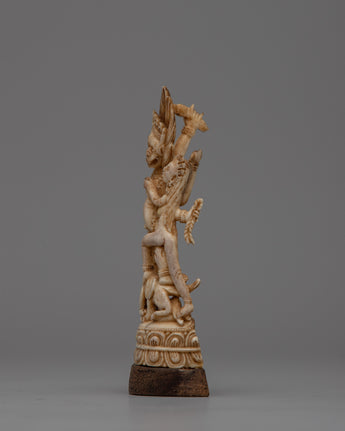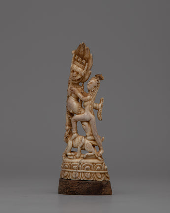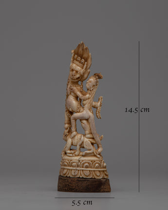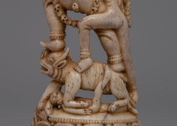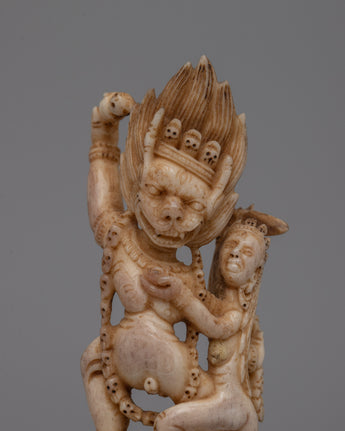 The magnificent Buddhist Deity Yamantaka With Consort Yami Statue was painstakingly crafted from ethically sourced buffalo bone. This 14.5 cm-high statue shows Yamantaka—the angry embodiment of Manjushri—with his partner Yami. Yamantaka is a powerful and protective figure who eliminates negativity and impediments. The fine workmanship perfectly reflects this energy. The statue's use of buffalo bone gives it a distinctive texture and authenticity while demonstrating the artists' commitment to using sustainable materials and traditional techniques.