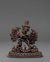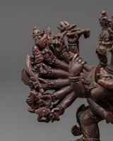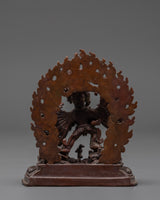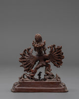 Yamantaka's strong imagery, together with his spouse, symbolizes ultimate spiritual unification, expressing wisdom and compassion in perfect harmony. This religious sculpture serves as a reminder of spiritual development and the path to enlightenment, adding a profound presence to any sacred or meditative space. Oxidized copper's warm, ancient tones increase its spiritual atmosphere, adding authenticity and cultural depth to any room.