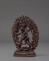 This Tibetan Protector Deity Yamantaka Sculpture, a symbol of transformation and insight in Vajrayana Buddhism, will attract great spiritual energy to your holy place. This magnificent piece is 12.5cm tall, 10cm wide, and weighs 0.53kg. It is masterfully carved from oxidized copper, capturing Yamantaka's complicated form and forceful presence. Yamantaka is revered as a powerful protector deity who embodies the triumph over ignorance and negativity, making this statue an excellent centerpiece for meditation rooms, prayer areas, and personal shrines. Its meticulous craftsmanship represents centuries of Buddhist artistry, lending cultural richness and spiritual value to any environment.