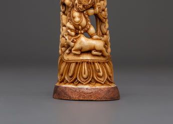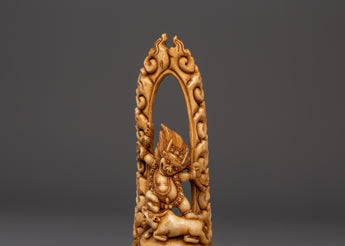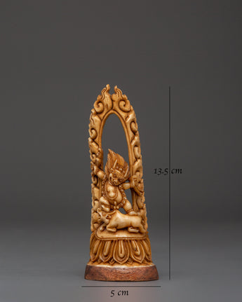 This wonderfully sculpted Yamantaka bone statue is 13.5cm tall and 5cm broad, carved from ethically sourced yak bone, and stands on a wooden base. Weighing only 0.050kg, this small figurine depicts Yamantaka's furious appearance, representing Manjushri's wrathful manifestation, the Bodhisattva of Wisdom. The beautiful craftsmanship depicts the deity victorious, standing over a buffalo, symbolizing the destruction of death and ignorance.
