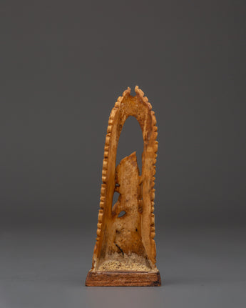 This Yamantaka bone statue is full of symbolism: His ferocious visage and dynamic posture represent the ability to defeat death and negative forces. The flames around the figure indicate transforming force, while the buffalo beneath depicts defeating ignorance and samsara. This statue’s delicate carving draws attention to these potent spiritual aspects, encouraging devotion and protection.