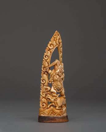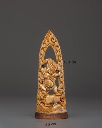 This delicately handcarved Yamantaka Destroyer of death statue is 14.5cm tall and 5.5cm wide, made from ethically sourced yak bone, and stands on a wooden base. The figurine, weighing 0.058kg, depicts Yamantaka, the wrathful incarnation of Manjushri, triumphantly standing over a buffalo, signifying the destruction of death and ignorance. The exquisite carving emphasizes the deity's furious look and forceful attitude, which symbolize spiritual transformation.