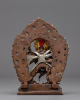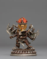 The Hayagriva Wrathful Manifestation of Chenrezig Figurine is a representation of fierce compassion, symbolizing Avalokiteshvara's protective and transformational qualities. This tiny yet mighty statue, measuring 5.1"/13cm (Height) by 3.9"/10cm (Base) and weighing 0.45 kg, is ideal for personal shrines, meditation areas, or as a travel-friendly sacred item. This statue is composed of oxidized copper, gracefully silver-plated, and decorated with elaborate gold and acrylic paints.