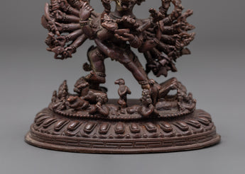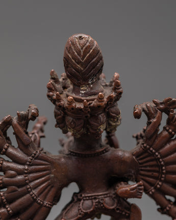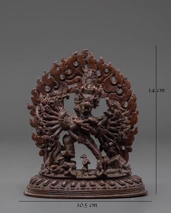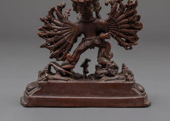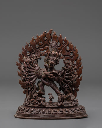 Yamantaka's strong imagery, together with his spouse, symbolizes ultimate spiritual unification, expressing wisdom and compassion in perfect harmony. This religious sculpture serves as a reminder of spiritual development and the path to enlightenment, adding a profound presence to any sacred or meditative space. Oxidized copper's warm, ancient tones increase its spiritual atmosphere, adding authenticity and cultural depth to any room.