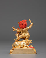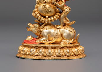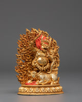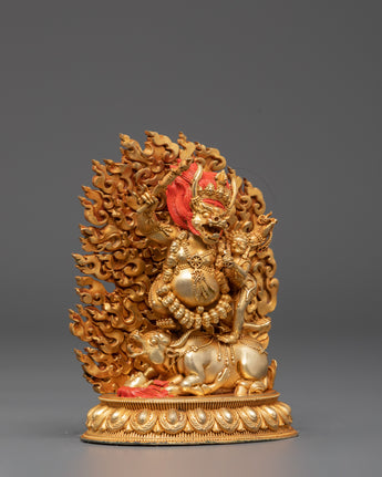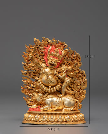 The Tantric Deity Yamantaka Sculpture is a powerful depiction of the venerated deity in Tibetan Buddhism, representing victory over death and the removal of barriers. This intriguing statue, measuring 13cm tall and 9.5cm wide, is made of copper and gold-plated to reflect the deity's heavenly spirit. Yamantaka, commonly shown with numerous limbs and fearsome features, represents the immense power required to combat evil forces and safeguard practitioners on their spiritual journey. The elaborate features and gold accents create a bright, holy presence in any altar or meditation room.