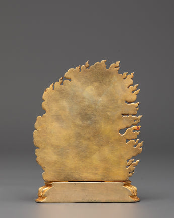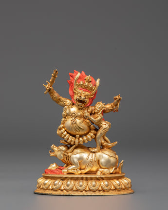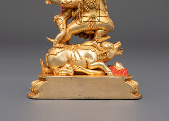 This Yamantaka sculpture depicts the deity's terrifying aspect and dynamic form, evoking his position as a protector in Buddhist teachings. The gold-plated finish casts a dazzling radiance, emphasizing Yamantaka's unwavering drive to remove obstacles and smooth the way to enlightenment. The copper body adds warmth and depth, anchoring the statue's energy and accentuating its spiritual significance. Whether put on an altar, in a temple, or as part of a spiritual collection, this statue is an effective visual and symbolic tool in rituals and meditations.