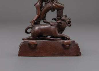 This Tibetan Protector Deity Yamantaka Sculpture, a symbol of transformation and insight in Vajrayana Buddhism, will attract great spiritual energy to your holy place. This magnificent piece is 12.5cm tall, 10cm wide, and weighs 0.53kg. It is masterfully carved from oxidized copper, capturing Yamantaka's complicated form and forceful presence. Yamantaka is revered as a powerful protector deity who embodies the triumph over ignorance and negativity, making this statue an excellent centerpiece for meditation rooms, prayer areas, and personal shrines. Its meticulous craftsmanship represents centuries of Buddhist artistry, lending cultural richness and spiritual value to any environment.