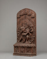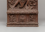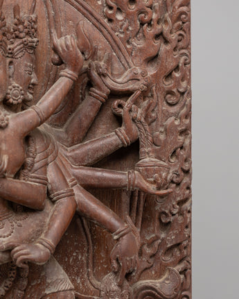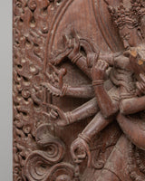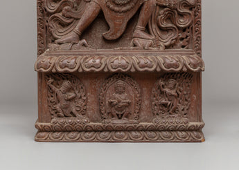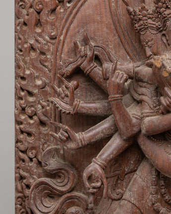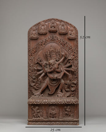 The statue's design is rich with symbolic meaning. The central depiction of Chakrasamvara, surrounded by eight arms, showcases his ability to perform multiple acts of compassion, each arm holding a different tool of enlightenment. The fine wood carving reflects the fluid movement of Chakrasamvara and his consort, symbolizing the dynamic nature of spiritual practice. The intricate detailing of the flame-like motifs surrounding the figures represents the transformative power of spiritual fire, purifying the obstacles to enlightenment. The lower base features additional Buddha figures, emphasizing the deity's role in guiding beings towards liberation.
