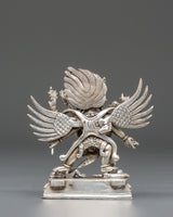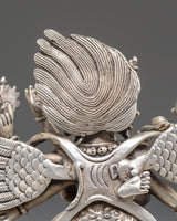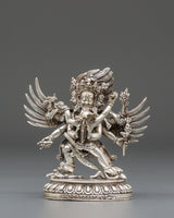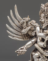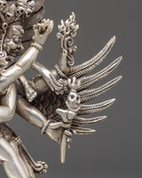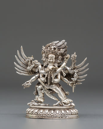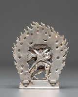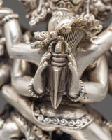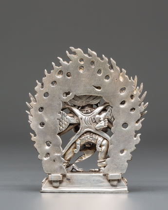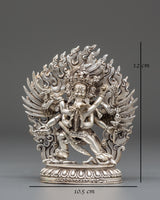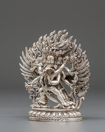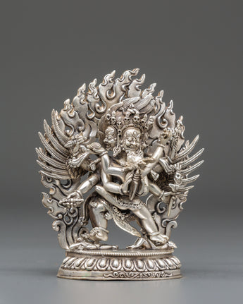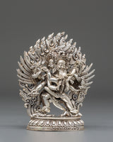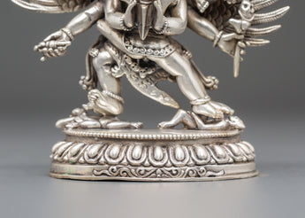 Vajrakilaya is a wrathful deity who embodies the power of purification. His fierce expression and dynamic posture represent the destruction of harmful energies, empowering the practitioner to overcome the five poisons of attachment, anger, ignorance, jealousy, and pride. This deity's role in removing obstacles makes the Vajrakilaya Deity Statue a powerful protective figure in any spiritual practice. The silver-plated detailing enhances the intricate design, symbolizing the refined wisdom and compassionate power that underlie Vajrakilaya's wrathful appearance.