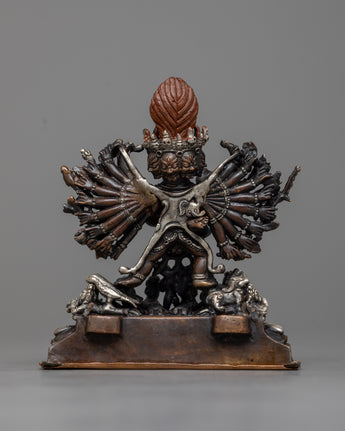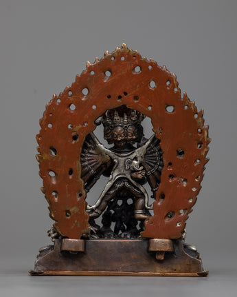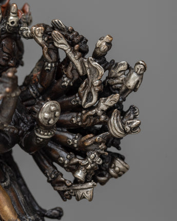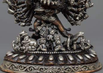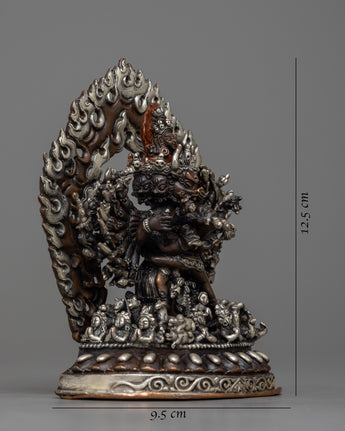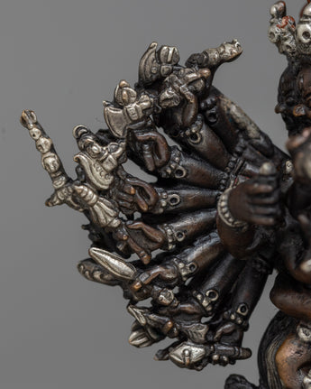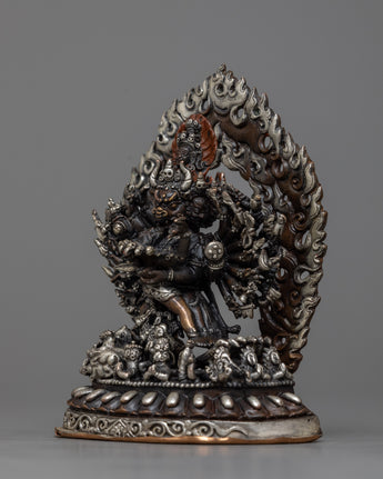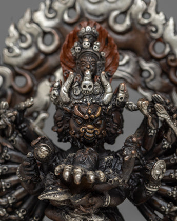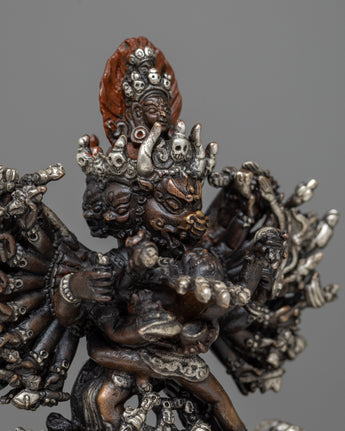 The Machine-Made 12.5-inch-tall Yamantaka wife Statue skillfully depicts the vengeful deity Yamantaka, and it is silver-plated over an oxidized copper body. This depiction embodies the vitality and meaning of the Yamantaka in Tibetan Buddhism, signifying the fusion of compassion and wisdom in order to conquer adversity.