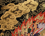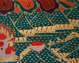 Encircled by blazing flames, his blue body symbolizes the fire of understanding that dispels illusions and opens the door to enlightenment. His main head resembles that of a buffalo, representing unshakable power and the ability to overcome all obstacles. Above his fierce face, the serene head of Manjushri signifies supreme wisdom, which transcends fear and destruction. Swirling clouds in the background of this Thangka illustrate the transience of the material world and the cycle of birth, death, and rebirth. Below him, mountains and patterns resembling flames signify knowledge and enlightenment. These elements guide practitioners toward liberation by emphasizing transformation and purification. This thangka serves as an effective tool for transformation and meditation.