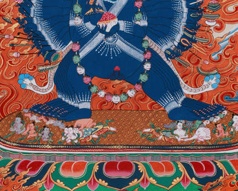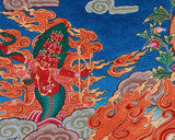 In this thangka, Yamantaka is depicted with multiple heads, 32 arms, and 16 legs, each rendered to embody his omniscient presence and unstoppable force. The central buffalo face snarls with flaming wrath, while above it rises the serene countenance of Manjushri, signifying ultimate wisdom behind the fury. He stands triumphantly upon a sun-disc lotus throne, trampling symbolic figures representing ego, hatred, desire, and death. His garland of severed heads and bone ornaments signifies the transformation of ignorance into transcendent awareness. Surrounding Yamantaka are complementary wrathful protectors, anchoring the thangka in a sacred cosmic field.
