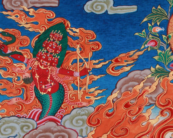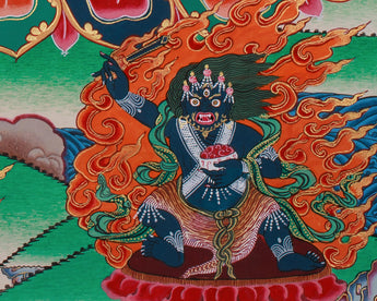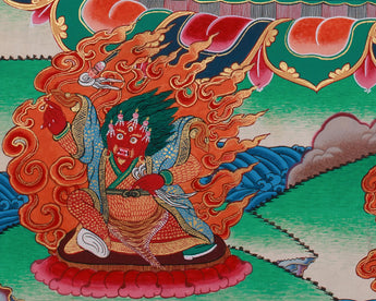 The background is richly painted with Tibetan landscapes, evoking both the terrestrial and transcendental realms in which Yamantaka operates. This rare and fierce thangka is ideal for advanced Vajrayana practitioners, tantric meditators, or collectors of sacred Buddhist art.