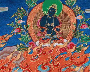 This Yamantaka Thangka is a stunning painting of Himalayan sacred art, hand-painted on cotton canvas using natural acrylic pigments and 24K gold highlights. Created by a Nepali artisan in the traditional lineage, it showcases the highest level of ritual workmanship and iconographic precision. Yamantaka—whose name means “Destroyer of Death”—is the wrathful form of Manjushri, the Bodhisattva of Wisdom, and symbolizes the enlightened mind’s power to annihilate ignorance and samsaric fear.