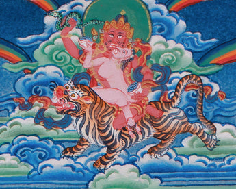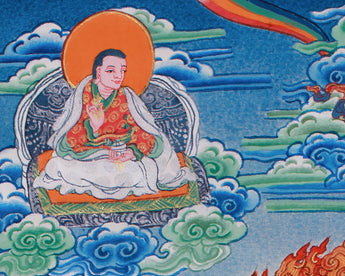 The Samputra Tantra is a pivotal text in Vajrayana Buddhism, and this thangka brings its core themes of spiritual purification and transformation to life. The powerful Buddhist Master, Chitipati, and Black Dzambhala surround the figure. Chitipati symbolizes the transcendence of life and death, and Black Dzambhala represents the spiritual abundance that comes from embracing the Samputra Tantra path. Every figure and symbol in this thangka, from the deities to the celestial beings, is meticulously painted to convey the essence of spiritual purification, prosperity, and impermanence. It is not only a beautiful work of art but also a powerful tool for meditation, reflection, and connecting with the transformative energies of the Tantric Buddhist path.