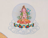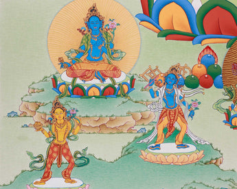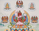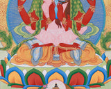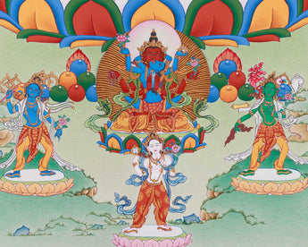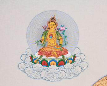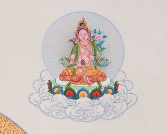 Surrounding him are enlightened deities from the Dhyani Buddhas, including peaceful manifestations of Avalokiteshvara associated with Ratnasambhava, Amitabha, Amoghasiddhi, and Akshobhya Buddhas. These figures symbolize the beautiful transformation of negative emotions into wisdom and enlightened action. Flanking the composition are four wisdom dakinis and a lower row of five vajra goddesses, each representing the purification of the five senses. These enlightened forms create a sacred visual map of the awakened mind, making this thangka not just devotional but a tool for meditation, reflection, and spiritual insight.