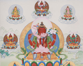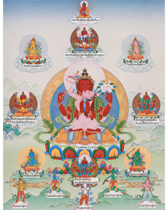 Tantric Form of Compassion, Gyalwa Gyasto | Red Chenrezig with Dakinis and Dhyani Buddhas