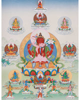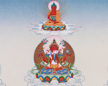 At the center of the thangka is Gyalwa Gyasto, the red manifestation of Avalokiteshvara (Chenrezig), depicted in a symbolic embrace that signifies the union of compassion and transcendent wisdom. This form, highly esteemed in Vajrayana Buddhism, embodies all Buddhas and is venerated in advanced meditation practices for cultivating bodhicitta—the awakened heart. With multiple arms holding traditional sacred objects, he exemplifies the infinite methods by which enlightened compassion manifests to liberate sentient beings. Seated on a lotus throne beneath Amitabha Buddha, who radiates divine light from above, Gyalwa Gyasto functions as the focal point of this visual mandala.