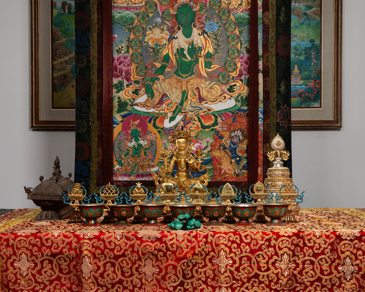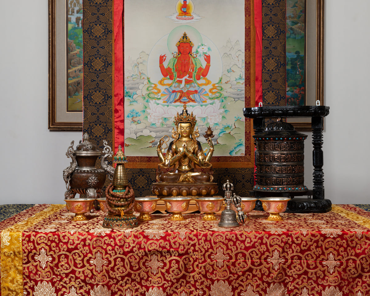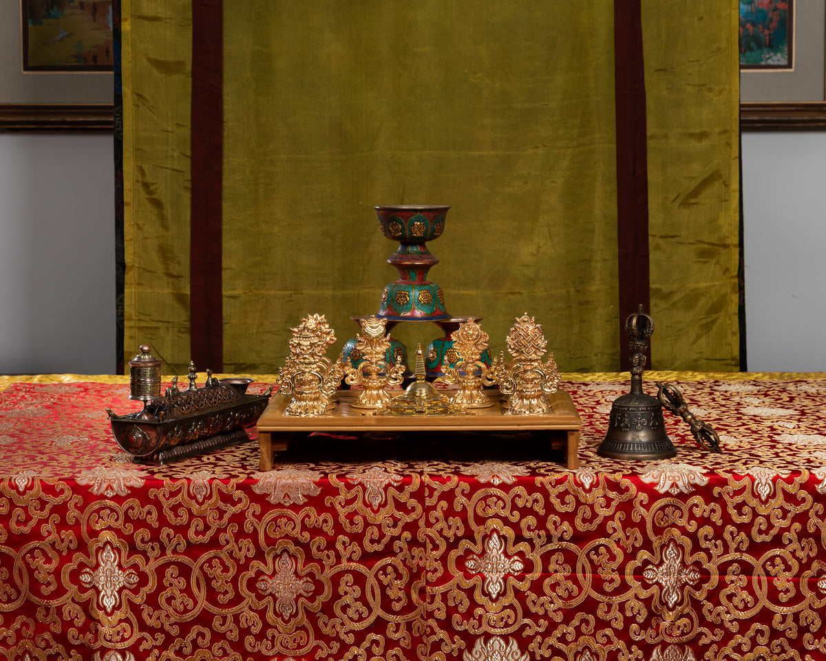 The center establishes orientation—a form that reminds the mind of its potential for awakening. The offerings cultivate generosity—water, light, and fragrance given without expectation, repeated daily. The ritual tools train involvement—objects that are handled, not observed, bringing the body into practice. The extended elements hold the environment—quietly supporting the space beyond what is immediately seen.