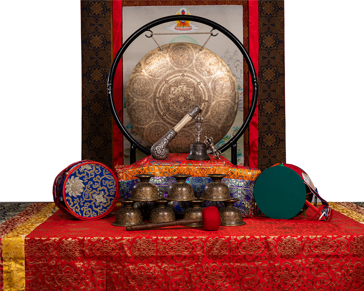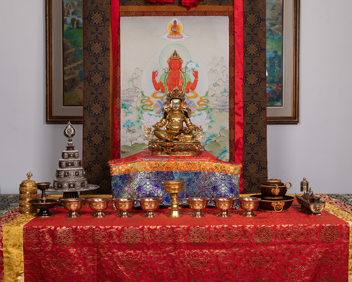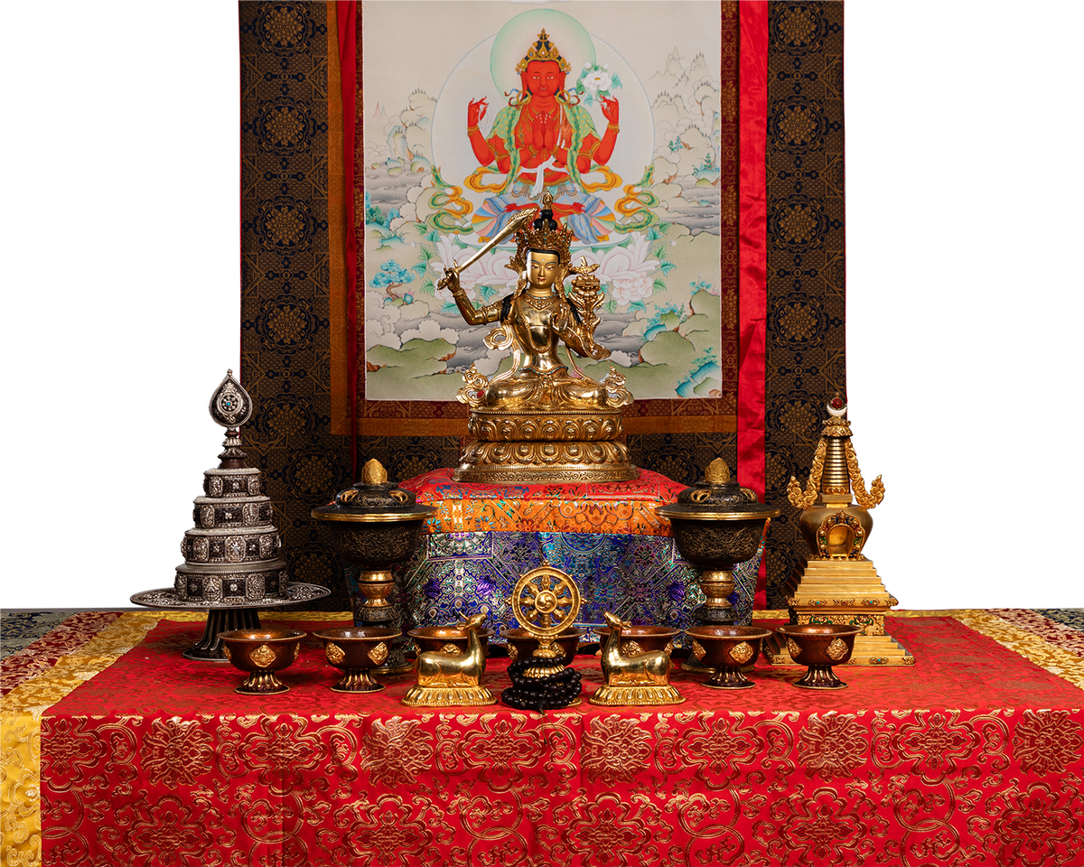 The center establishes orientation—a form that reminds the mind of its potential for awakening. The offerings cultivate generosity—water, light, and fragrance given without expectation, repeated daily. The ritual tools train involvement—objects that are handled, not observed, bringing the body into practice. The extended elements hold the environment—quietly supporting the space beyond what is immediately seen.