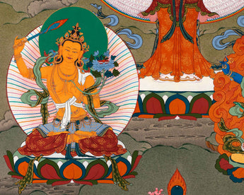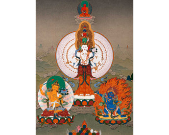 Chenrezig, also known as Avalokitesvara, is one of the most popular Bodhisattvas in Vajrayana. Chenrezig means gazing with the eyes of compassion in Tibetan words. Avalokitesvara Thangka is used to practice visual meditation to develop a calm, kind, and compassionate heart.
