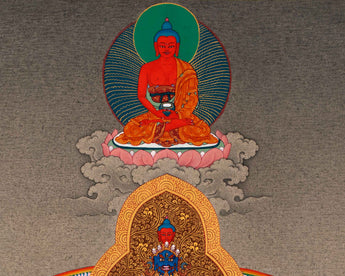 We have exclusively hand-painted the 1000 Arm Chenrezig Thangka using acrylic paintings on a cotton canvas. Alongside Chenrezig, we have also placed Manjushri, Vajrapani, and Amitabha Buddha in the painting. Chenrezig is the focus deity here. He is portrayed wearing precious ornaments and colorful designed silk. Out of 1000 arms, his left hands hold a lotus, bow, arrow, and Empowerment vase, respectively, whereas his right hands hold a crystal rosary, Dharmachakra, respectively. To further highlight the features of the deity, we have used genuine 24K gold. This gives the paintings a mesmerizing shine. This will be a perfect gift for a practitioner like you from Nepal.