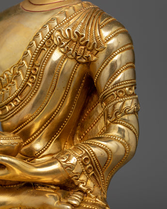 Introducing our 12-inch Shakyamuni Buddha Sculpture, a masterful creation Rising 12.0 inches tall with a base measuring 9.6 inches. Weighing 4.13 kg, this statue is expertly crafted from high-quality copper, embellished with 24K gold gilding, and detailed with gold and acrylic paintings, reflecting the highest standards of craftsmanship and devotion. Handcrafted by skilled artisans in Patan, Nepal,