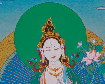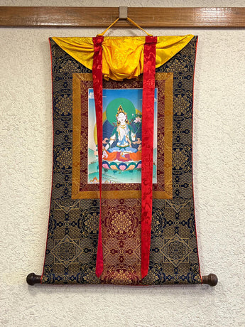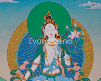 Invite the blessing of White Tara into your home with this handmade thangka, a profound symbol of healing, longevity, and compassionate grace.