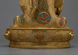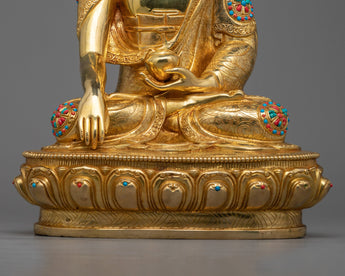 Our 13-inch Shakyamuni Buddha Statue is an expression of peace and enlightenment. This artwork is intended to bring the Buddha's eternal teachings into any place. Its 13.3-inch height makes it an ideal centerpiece for creating a calm and thoughtful environment. The statue is handcrafted from a solid copper body and gilded in rich 24K gold, showcasing the Buddha's delicate curves and tranquil expression. Gold and acrylic paintings are skillfully applied, highlighting Shakyamuni's compassionate gaze and the delicate intricacies of his monastic attire.