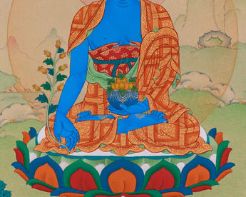 The healing Bhaisajyaguru painting is beautifully hand-painted on cotton canvas with vibrant acrylic colors and genuine 24K gold. Created in the traditional Karma Gadri style, this artwork features Bhaisajyaguru, the Medicine Buddha, whose divine presence shines through lively colors and luminous gold details. The use of acrylic paints adds depth and energy to the piece. Meanwhile, the gold highlights sacred elements, such as the nectar vase and the intricate patterns on his robes, giving the painting a warm and radiant spiritual glow.