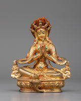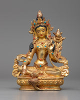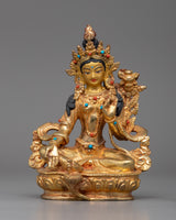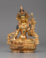 This beautiful and grand statue set of 21 Tara Goddesses has been hand-carved by Vajrayana artists in our studio. Each of the statues is made of refined copper, which is then gilded in pure 24K gold for that lustrous final finish. Each Tara is different from one other, therefore are represented according to their own characteristic iconographies and hand gestures. The figures are embossed with colorful, beautiful gemstones that enhance the beauty of the statue while also adding a sense of luxury. The statues are also highlighted with acrylic paints for their facial expressions. The elaborate artistic patterns were hand-carved using a hammer and tiny chisels. Every detail has been crafted with care and precision, resulting in a truly magnificent work of art.