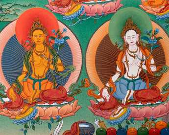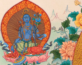 The 21 Tara Thangka is composed of 21 Tara visualizing her ultimate non-dual forms. The artist has painted her serene nature in a royal ease position with Lotus Stalks in her left hand and right hand in a gesture of excellent giving. The lush green color balances the richness of her forms with ornaments and preserves the traditional practice.