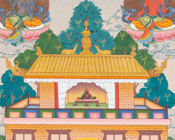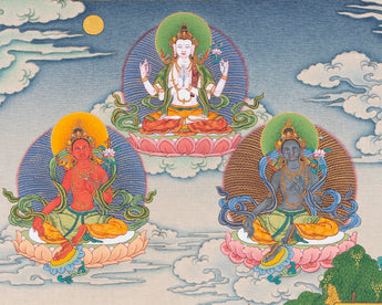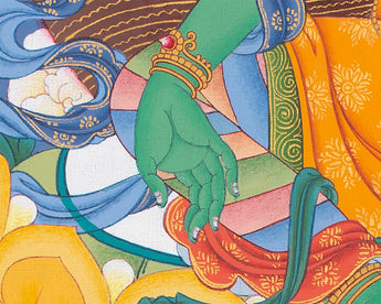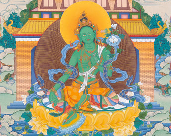 The 21 Tara Thangka is composed of 21 Tara visualizing her ultimate non-dual forms. The artist has painted her serene nature in a royal ease position with Lotus Stalks in her left hand and right hand in a gesture of excellent giving. The lush green color balances the richness of her forms with ornaments and preserves the traditional practice.