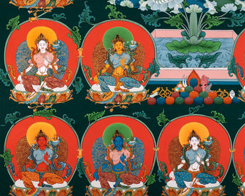 Twenty-one Tara Thangka prints can be the perfect gift for a Buddhist practitioner like you. Following the tradition ofOrgyen Chokyur Dechen Lingpa, we painted this Rare 21 Tara assembly thangka in our studio.