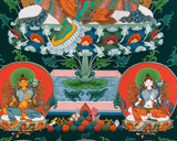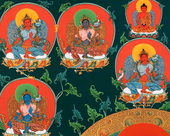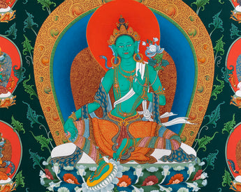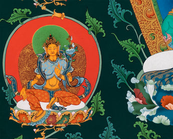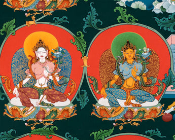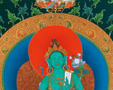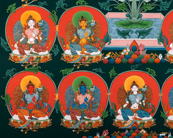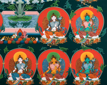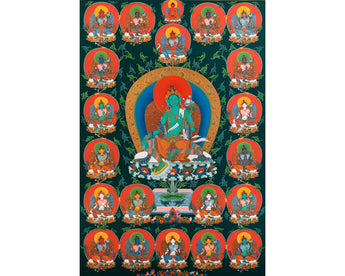 The 21 Tara Thangka depicts 21 Taras in their ultimate non-dual forms. Her tranquil demeanor is depicted in a royal ease posture, holding Lotus Stalks in her left and right hands in a sign of a wonderful offering. The richness of her forms with embellishments is balanced by the luscious green color, which maintains the traditional practice.