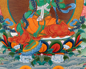 This 21 Tara Thangka is composed of 21 Tara visualizing her ultimate non-dual forms. We have painted her serene nature in a royal ease position with Lotus Stalks in her left hand and right hand in a gesture of excellent giving. The lush green color balances the richness of her forms with ornaments and preserves the traditional practice.