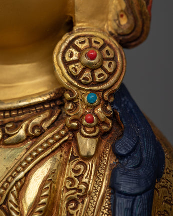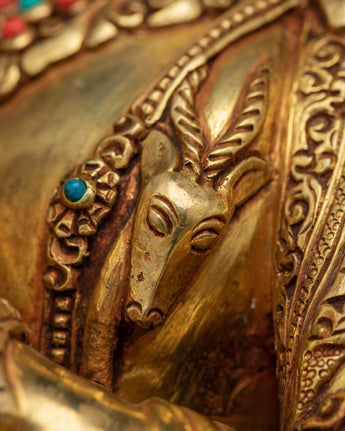The statue's sturdy copper body is delicately coated in 24K gold, creating a dazzling background for the flawless acrylic and gold paints that highlight Chenrezig's elaborate attire and tranquil countenance. Hand-carved gemstones represent the divine qualities of the Bodhisattva and provide a hint of celestial beauty. At 4.268 kg, its presence is perfect for adding a substantial touch to a private collection or to the spiritual atmosphere of any meditation room.