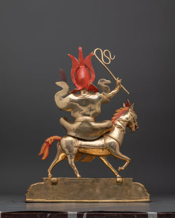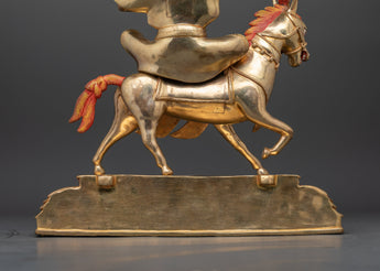 This beautiful King Ghesar statue is 22.8 inches tall with a 16.9-inch base and weighs 9.47 kg. This statue, made of the finest copper, is embellished with 24K gold gilding and elaborate gold and acrylic paints that portray the grandeur and majesty of monarch Ghesar, a mythical hero and warrior monarch. Every element, from his royal posture to his expressive facial features, is painstakingly hand-painted, demonstrating the artist's attention to detail.