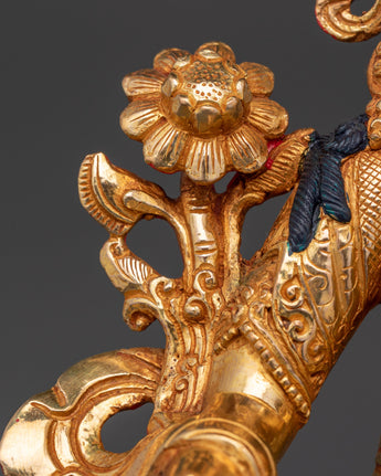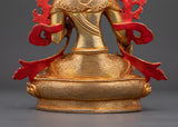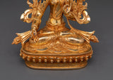 Thishandcrafted 24K Gold Gilded White Tara Art is made from copper and meticulously gilded with pure gold, embodying spiritual significance and artistic excellence. The delicate gold and acrylic paintings bring out the intricate details of her face, crown, and robes, creating an aura of divine grace. The artisans of Patan, Nepal, have used traditional techniques to craft this statue, ensuring that each piece is both a stunning work of art and a meaningful spiritual object. The combination of gold gilding and masterful craftsmanship highlights her divine elegance, making this statue a treasured addition to any spiritual space.