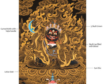 This exuberant Mahakala Bernagchen Thangka is done with acrylic color and genuine 24K Gold on cotton canvas. Revered as the protective deity in Tibetan Buddhism, the deity is depicted with a fierce appearance wielding a curved knife with a Vajra handle representing his power to conquer obstacles and to cut through any obstacle. The deity wears a five-skulled crown representing his mastery over the five poisons: ignorance, attachment, anger, jealousy, and pride regally seated atop a sun disc Lotus seat.