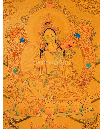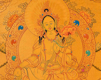 According to the legend, Tara is an emanation of Chenrezi, the Bodhisattva of Compassion. Once when Chenrezi was very moved by the suffering of all sentient beings, he shed two tears. The tear from his right eye turned into the green form of Tara and the tear from his left eye turned into the white form.
