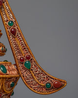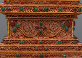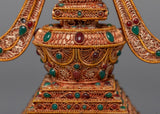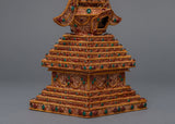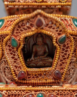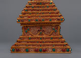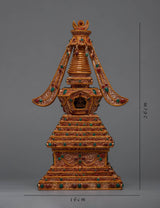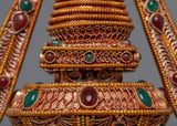 The Buddha Stupa is beautifully hand-carved for the Buddhist Shrine. The stupa is coated with 24K genuine gold. At the Bhumba the Small Buddha Stue is carved. A stupa is a Square base containing Buddhist relics. The Red Stone is placed at the top of the jewel and the moon, which makes the stupa very beautiful. At the parasol, the gemstones are hanging around. At the center, you can see the beautiful statue placed.
