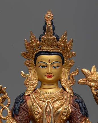 This copper statue has layers of gold gilding, which gives it a brilliant, long-lasting polish and a tranquil, regal appearance. The figure of Chenrezig is given lively life with acrylic paintings and gold, which accentuate the fine features.