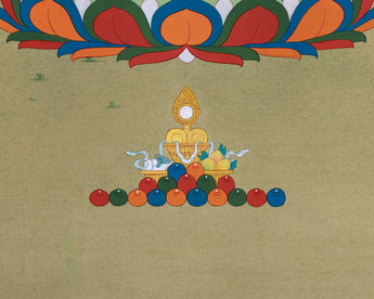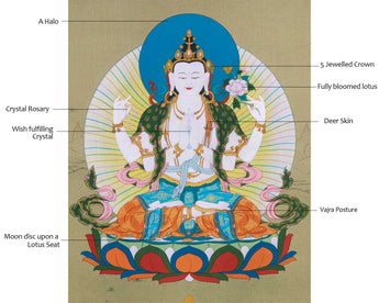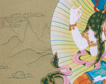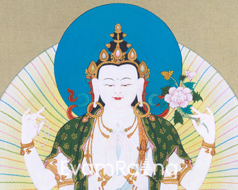 Each brushstroke resonates with the artist's reverence, capturing the compassionate gaze and serene countenance of Chenrezig. With arms outstretched in graceful mudras, Chenrezig offers solace and protection to those in need, embodying the infinite compassion of the Bodhisattva ideal.