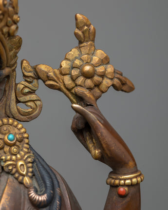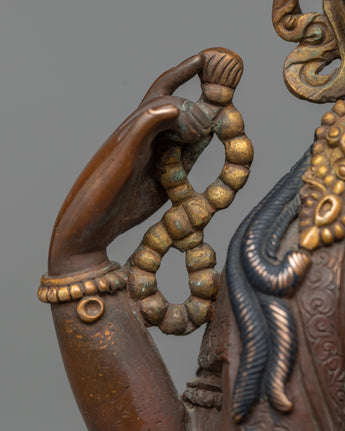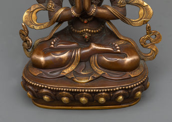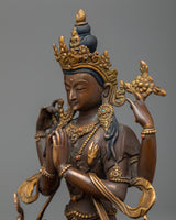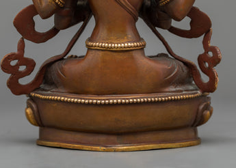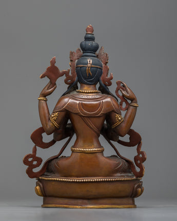 Compassion and loving-kindness. This statue, made of sturdy, oxidized copper, has a rustic elegance that alludes to the everlasting character of Chenrezig's love.