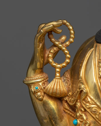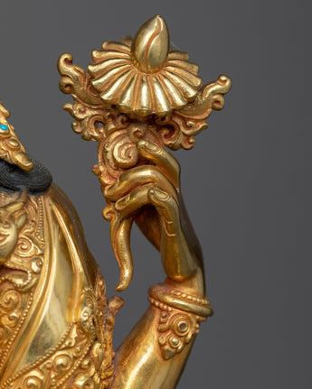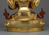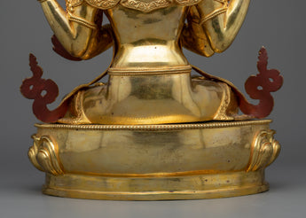 The 4-Armed Deity "Chenrezig" statue transports you to a realm where love has no bounds. Each feature of this magnificent creation is brought to life with meticulous intricacies set atop a robust copper basis, a tribute to impeccable creativity. The gleaming brilliance of 24K gold gilding, along with captivating gold and acrylic paintings, creates a tapestry of unbounded compassion and charity.