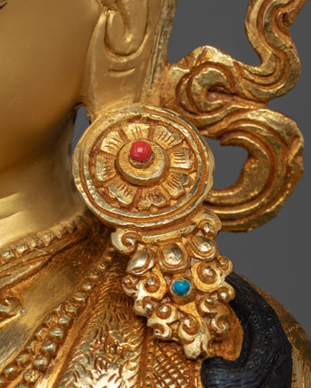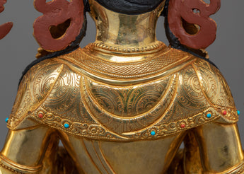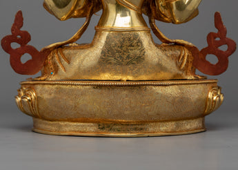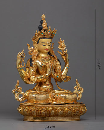 The statue depicts the 4 arms Chenrezig Sculpture or the Bodhisattva of compassion. This Tibetan Sculpture was handcrafted in Kathmandu by a Nepali artist with a copper body and gilded in genuine 24K Gold. Chenrezig's first two hands, palms together, are clasped around his heart, carrying a wish-fulfilling diamond in a namaste posture. The second hand on his right has a crystal rosary. The second hand on his left holds a golden lotus, the purest of flowers despite its muck origins—the nectar of his compassionate understanding stored in the third hand. The statue is decorated with precious jewels that have been embedded on the statue.
