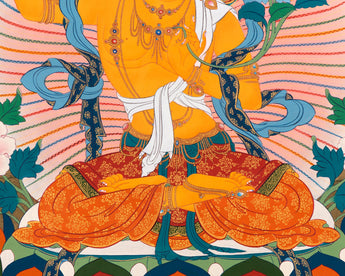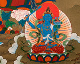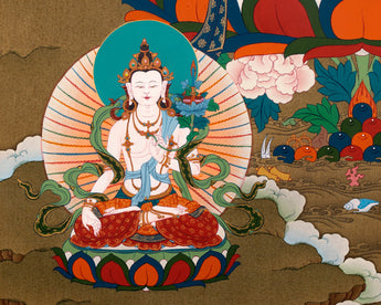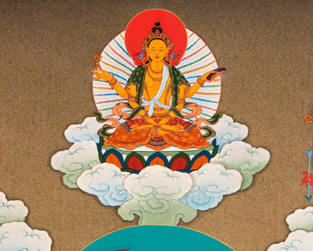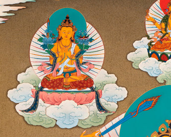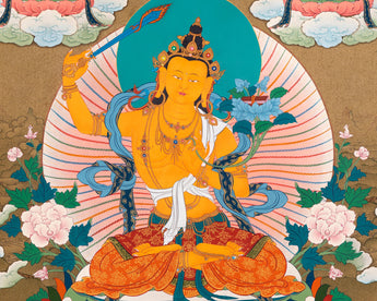 Bodhisattva Manjushri is the embodiment of the wisdom of all the Buddhas. The Buddhists believe that he is the sole deity of wisdom who blesses the devotees to sharpen their memory and intellect. His right hand holds the sword of the wisdom of emptiness for destroying ignorance, the root cause of the sufferings. His left hand holds a lotus flower on which the book of transcendental wisdom is placed. He is adorned with rich and precious ornaments and a diadem.This Manjushri thangka will be a great gift for a practitioner like you!