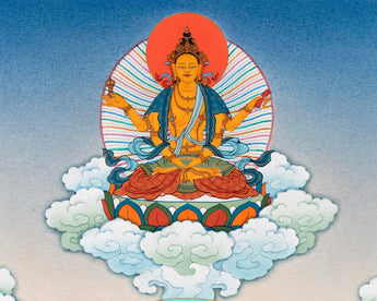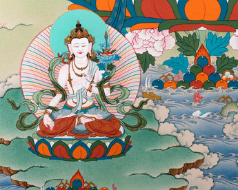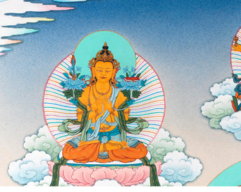 Bodhisattva Manjushri is the embodiment of the wisdom of all the Buddhas. The Buddhists believe that he is the sole deity of wisdom who blesses the devotees to sharpen their memory and intellect. His right hand holds the sword of the wisdom of emptiness for destroying ignorance, the root cause of the sufferings. His left hand holds a lotus flower on which the book of transcendental wisdom is placed. He is adorned with rich and precious ornaments and a diadem.This Manjushri thangka will be a great gift for a practitioner like you!