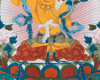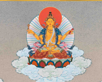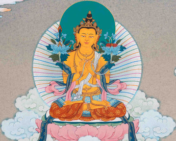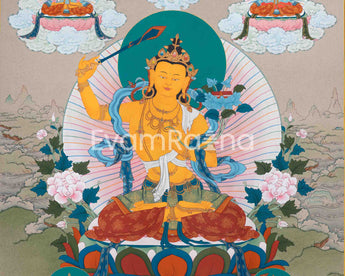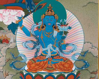 5 Manjushri Thangka's artwork is created on a foundation of cotton canvas. The artist uses Vibrant acrylic colors, enabling layered and expressive depictions on the canvas. Whether used as paint or as gold leaf, real 24K gold adds a hint of luxury and spiritual meaning, signifying enlightenment and purity. This mixed-media artwork aims to portray the profound wisdom and sacred essence associated with Manjushri in a way that is both aesthetically pleasing and spiritually meaningful by traditional elements.